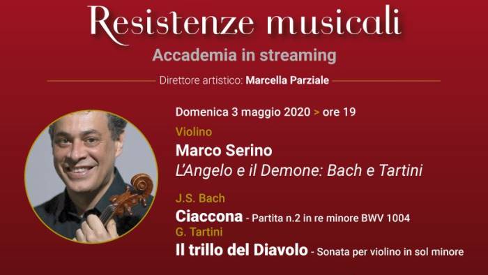 Domenica 3 maggio alle 19 Marco Serino il Konzertmeister-primo violino dell’Orchestra da Camera dell’Accademia di Santa Sofia, eseguirà il suo concerto L’Angelo e il Demone: Bach e Tartini, per la quarta tappa di Resistenze Musicali – Accademia in streaming, la rassegna musicale diffusa on line e diretta da Marcella Parziale, gratuitamente disponibile sulla pagina Facebook dell’Accademia di Santa Sofia.