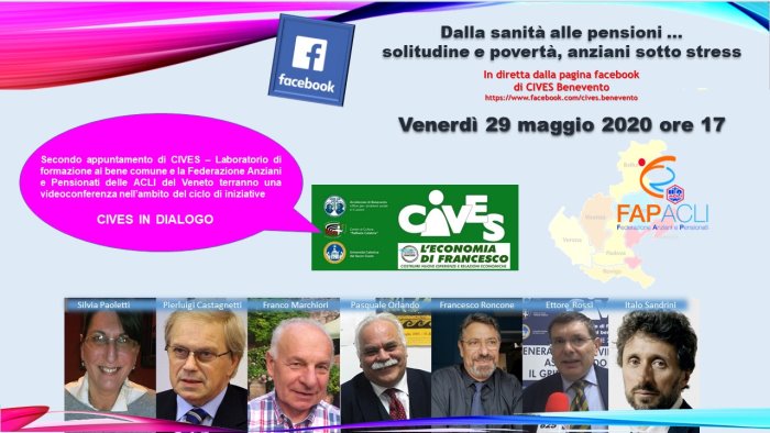 Venerdì 29 maggio alle ore 17.00 CIVES – Laboratorio di formazione al bene comune e la Federazione Anziani e Pensionati delle ACLI del Veneto terranno una seconda videoconferenza sulla condizione degli anziani, nell’ambito del ciclo di iniziative CIVES IN DIALOGO, sul tema: “Dalla sanità alle pensioni…solitudine e povertà, anziani sotto stress”.