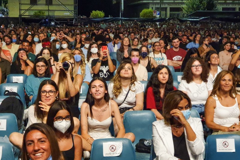 "È la mia prima volta a Benevento - saluta il pubblico -. Questa è la città di una persona che mi ha dato tanto: Attilio Cusani che cura i miei video musicali".