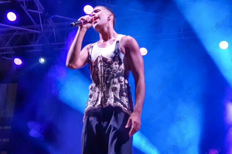 Uno show di suoni e luci che ipnotizza e affascina e Mahmood ne é mattatore con il suo iconico bustier d'ispirazione mitologica.