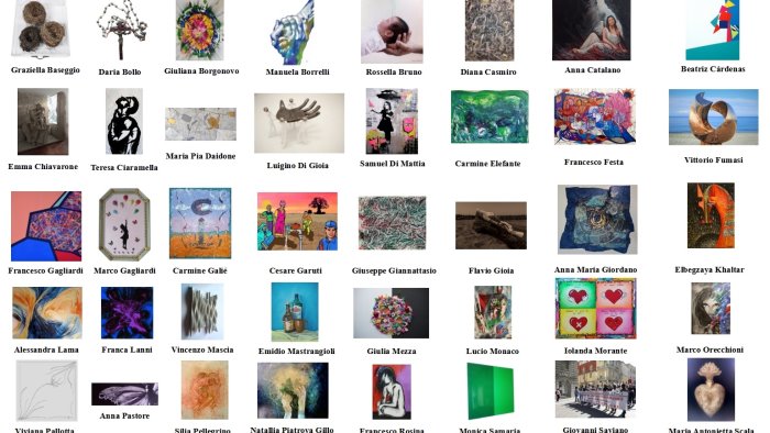 Gli artisti in esposizione sono ben 59: Adriano Andrighetto, Graziella Baseggio, Daria Bollo, Giuliana Borgonovo, Manuela Borrelli, Rossella Bruno, Michelina Camputaro, Beatríz Cárdenas, Diana Casmiro, Anna Catalano, Emma Chiavarone, Teresa Ciaramella, Maria Pia Daidone, Luigino Di Gioia, Samuel Di Mattia, Grazia Di Mezza, Carmine Elefante, Isabella Ferragamo, Francesco Festa, Vittorio Fumasi, Francesco Gagliardi, Marco Gagliardi, Carmine Galié, Cesare Garuti, Giuseppe Giannattasio, Flavio Gioia, Anna Maria Giordano, Elbegzaya Khaltar, Alessandra Lama, Franca Lanni, Vincenzo Maio, Alfredo Martinelli, Vincenzo Mascia, Emidio Mastrangioli, Giulia Mezza, Lucio Monaco, Iolanda Morante, Salvatore Oppido, Marco Orecchioni, Viviana Pallotta, Cosimino Panza, Anna Pastore, Silia Pellegrino, Natallia Piatrova Gillo, Francesco Rosina, Elio Russo, Monica Samaria, Giovanni Saviano, Maria Antonietta Scala, Giannino Scorzato, Alfredo Verdile, Claudio Verganti, Stefania Vitelli, Hassan Yazdani (Hassanski)” con un complessivo di 85 opere sul tema della solidarietà.