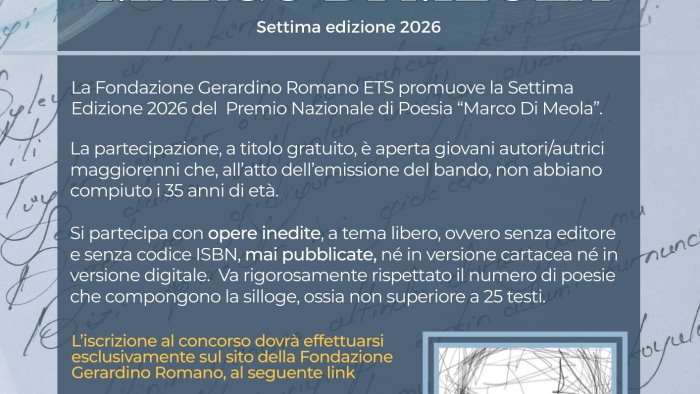 La Fondazione Gerardino Romano ETS di Telese Terme ha ufficialmente bandito la Settima Edizione 2026 del Premio Nazionale di Poesia “Marco Di Meola”, concorso dedicato alla memoria del giovane poeta cerretese scomparso nel 2012, a soli 28 anni.