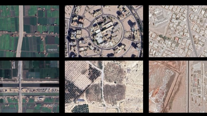 Attraverso una sequenza di fotogrammi satellitari, Campanella compone una linea ininterrotta che attraversa deserti, città, foreste, steppe e catene montuose. La Terra appare come un’unica superficie continua, osservata da una prospettiva orbitale che riduce la distanza a pura geografia e mette in discussione la frammentazione politica del pianeta.