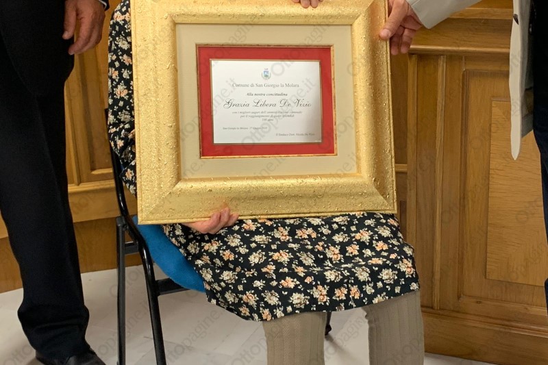 Cento rose rosse, una targa ricordo e l'immancabile atto di nascita. E così oggi il Municipio di San Giorgio la Molara, nel Sannio, è rimasto aperto per festeggiare Grazia Libera De Vizio nel giorno del suo centesimo compleanno. Una ricorrenza importante da celebrare tra l'affetto dei parenti. Ad accoglierla il sindaco di San Giorgio la Molara, Nicola De Vizio.