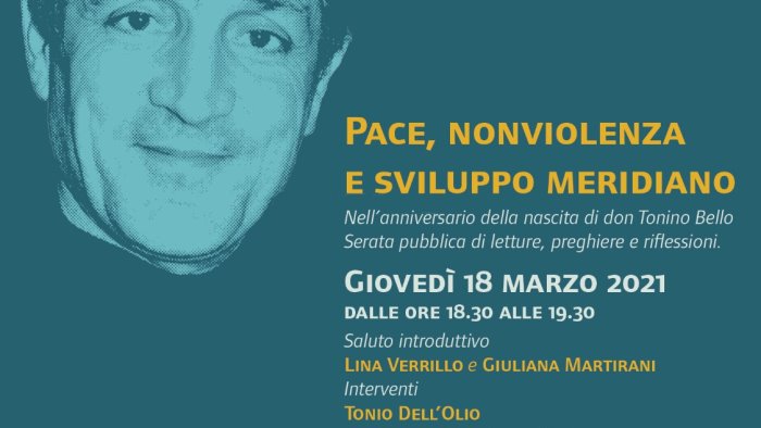 Giovedì 18 marzo prossimo, dalle 18:30 alle 19:30, la Casa per la Pace “don Tonino Bello”, insieme a Pax Christi Napoli, Fondazione don Tonino Bello e Fondazione Guglielmi Minervini, in occasione della nascita di don Tonino Bello, organizza una serata pubblica di letture, preghiere e riflessioni su “Pace, nonviolenza e sviluppo meridiano”. Ci sarà la possibilità di interventi spontanei e di letture da parte dei partecipanti che lo desidereranno. Al termine del momento, in chiusura, ci saranno i saluti da parte dei familiari di don Tonino Bello. Interverranno alla serata la referente di “Casa per la Pace” Lina Verrillo e il già presidente Mir (Movimento Internazionale della Riconciliazione) e membro del Direttivo dell’Ipra presso l’Onu (International Peace Research) e di Pax Christi Giuliana Martirani per un saluto introduttivo, Tonio dell’Olio della Pro Civitate Christiana di Assisi, Giancarlo Piccinni della Fondazione “don Tonino Bello” di Alessano (Lecce), Maria Turtur della Fondazione “Guglielmo Minervini”. L’evento sarà trasmesso in diretta sulle pagine fb di Casa per la Pace e della Pastorale Sociale e del Lavoro della nostra Diocesi.