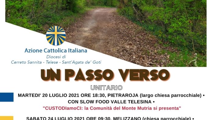 Spiritualità e formazione, orientamento dei passi da compiere sul tema della disoccupazione e dello spopolamento delle aree interne prendendo ad esempio un modello promosso da Slow Food Valle Telesina (quello dei giovani produttori ed imprenditori di Cusano, Civitella Licinio e Pietraroja), una capatina nella sfera dell’affettività (con la presentazione del libro di Federica Colangelo “Quella meravigliosa luce negli occhi”) e una passeggiata ambientale (con un’esperienza di ascolto con l’associazione di promozione sociale Love Matese). Questa la programmazione estiva, targata Azione Cattolica diocesana, per offrire prospettive di dono e di speranza per avviare processi e metterli in pratica, secondo una visione in cui il tempo supera lo spazio, il tutto la parte e la realtà è più importante dell'idea. “Un passo verso” per andare oltre la pandemia, ma soprattutto verso la speranza. “Un passo verso” è anche un passo attraverso la vita dei settori e gli sguardi attenti di ragazzi, giovani e adulti. I passi decisi dell’Acr di proporre in una struttura di San Gregorio Matese, sul lago Matese, un camposcuola per ragazzi dalla V Elementare alla III Media (dal 27 al 30 luglio) e una due giorni per responsabili (venerdì 30 e sabato 31 luglio), educatori e animatori. I passi appassionati del settore Giovani con l’organizzazione di due momenti sul Progetto Formativo aggiornato (giovedì 26 agosto e giovedì 9 settembre). I passi resistenti del settore Adulti di predisporre un incontro a fine agosto (lunedì 30 agosto). Con gli occhi aperti per cercare la bellezza dove, normalmente, non te lo aspetteresti mai. Ascoltando i segni dei tempi, "ascoltando Colui che ci parla".