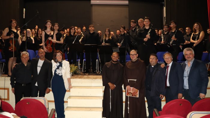 Ad aprire il concerto, introdotto dalla prof.ssa Luisa Luciano, la prima esecuzione assoluta dell’Inno a San Pasquale, composto da Salvatore Ruggiero, giovanissimo alunno del liceo musicale, su testo tratto da una preghiera per un infermo di Gelsomino Del Guercio. È stato il guardiano del Convento, padre Eduardo Ferreira de Brito, a ricevere in dono, dallo stesso autore, la prima partitura dell’inno eseguito dal coro e dall’orchestra sinfonica come ricordo della serata. Un’ora intensa di musica e di emozioni che gli alunni del liceo musicale, insieme ai loro ex- compagni già diplomati e ai docenti, guidati dalla bacchetta del prof. Pasquale Lanni, hanno saputo trasmettere ai presenti attraverso l’interpretazione di pagine di Vangelis, Jenkins, Jacob de Haan,