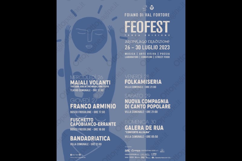 Le atmosfere silvane del bosco si tingono di musica, poi, con il Fuschetto - Capobianco - Errante (27/7) e, ancora, appuntamento sonoro con Bandadriatica (27/7) e “I mari d’oriente in accordi”. Il 28 luglio l’energia pulsante dei Folkamiseria per lasciare poi il passo nell’ultima serata di Feo Fest alla Nuova Compagnia di Canto Popolare (29/7), atomo in deflagrazione con cui la musica riscopre il suo significato primigenio e viscerale.