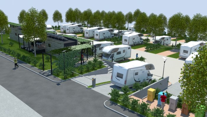 · un'area di manovra con 34 piazzole sosta per camper attrezzate con colonnine elettriche e idriche;