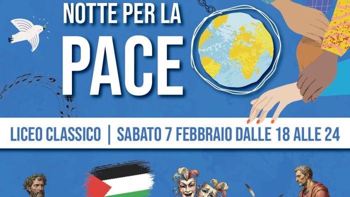 Quest’anno il Liceo Classico di Sant’Agata de’ Goti ha scelto di trasformare la tradizionale “Notte del Liceo” in un progetto speciale, dando vita a “La Notte per la Pace”, un evento nato dall’esigenza, anzi dall’urgenza, di non restare inerti di fronte a quanto sta accadendo nel mondo e di dare voce a un bisogno profondo e condiviso di pace, giustizia e punti di riferimento civili, nazionali e internazionali.