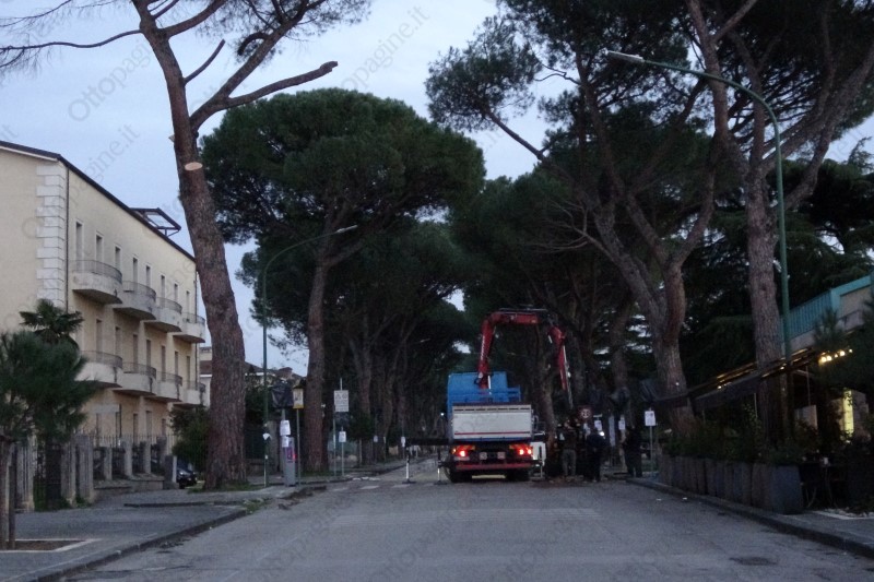 Taglio dei pini pericolanti al viale degli Atlantici, stop a operazioni