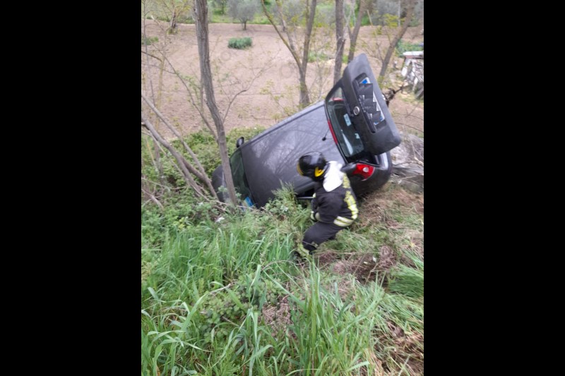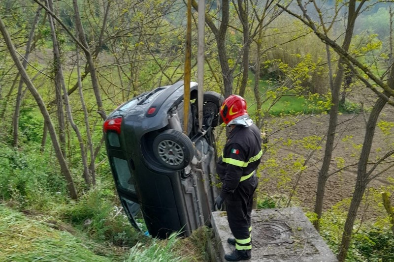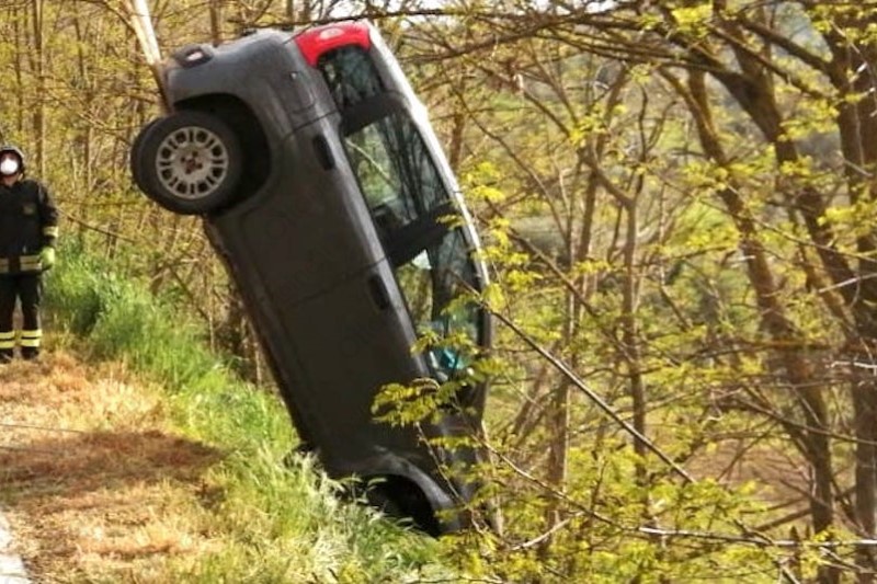 Paura per madre e figlio. Panda 'trattenuta' da un alberello e poi ancorata dai vigili del fuoco