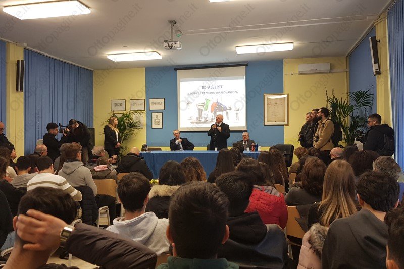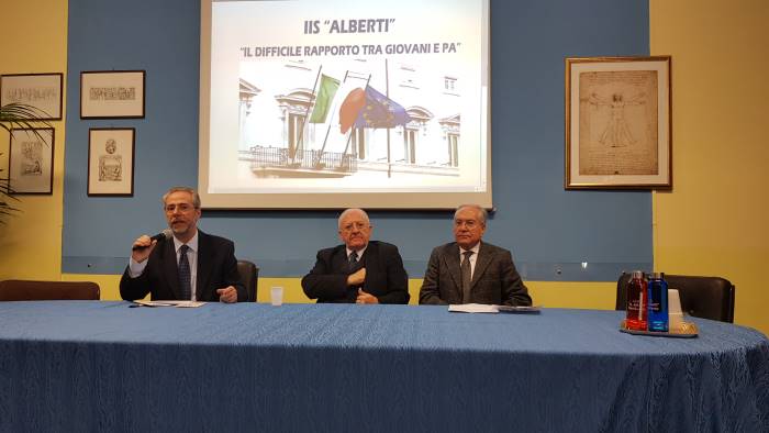 Nel confronto con gli studenti dell'Istituto Alberti De Luca ha discusso del “difficile rapporto tra i giovani e la pubblica amministrazione”.