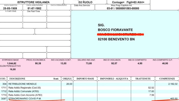 Tra i beneficiari di detto lavoro straordinario vi sono anche 40 operatori del Corpo di polizia municipale, su un organico di 44 unità, con compensi lordi che variano tra € 463,50 ed € 14,25. Tra gli operatori che hanno percepito l’emolumento ve ne sono due con € 460,80, uno con € 441,90, sei con € 441,00, uno con € 427,50, uno con € 374,00, uno con € 360,15, uno con € 345,45, uno con € 327,75, due con € 306,38, ecc.
