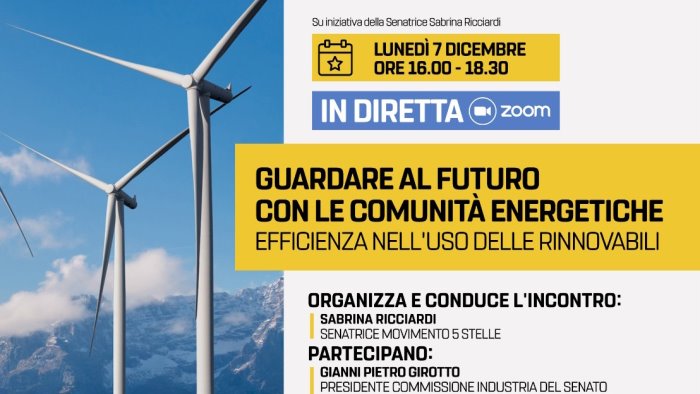 "Il nostro Paese necessita di un passaggio repentino dalle fonti fossili a quelle rinnovabili, battaglia che il Movimento 5 Stelle porta avanti sin dalla sua nascita. Nel solco di questa riconversione ecologica, capace di generare nuova occupazione e opportunità di progresso, il Governo sta fortemente spingendo la creazione delle “Comunità energetiche”, che consentono ai cittadini autoprodursi l’energia tramite impianti di loro stessa proprietà. Ciò permetterà di snellire il costo delle bollette, di ridurre l’uso delle fonti fossili e di creare nuovi posti di lavoro, mettendo in moto l'intero tessuto economico". Così la senatrice sannita Sabrina Ricciardi (M5S) annuncia di aver organizzato per lunedì 7 dicembre (dalle 16 alle 18.30) un virtual meeting su Zoom dal titolo "Guardare al futuro con le Comunità Energetiche, efficienza nell'uso delle rinnovabili". All'incontro in-line partecipano tra gli altri: Gianni Pietro Girotto (Presidente della Commissione industria del Senato), Giacomo Pucillo (Presidente dell'Ordine degli ingegneri di Benevento), Saverio Parrella (Presidente dell'Ordine degli architetti di Benevento), Giuseppe Gaggioli (Presidente di "Anaci-Benevento), Ugo del Sorbo (vicepresidente Provincia Benevento "Alac), Emilio Sani e Rolando Roberto dell’associazione Italia Solare, Egidio Grasso (Presidente dell’Ordine dei Geologi della Campania), Walter Nardone (Presidente dell’Ordine degli Agronomi) e Giampaolo Biele (Presidente del collegio dei geometri della Provincia di Benevento). Al termine del meeting saluteranno la senatrice Danila de Lucia e le portavoci comunali Marianna Farese e Anna Maria Mollica.