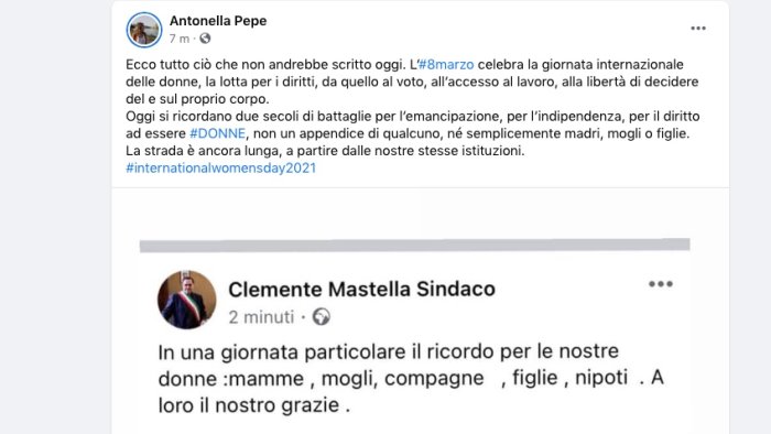 Augurio che però non è affatto piaciuto ad Antonella Pepe, coordinatrice della segreteria provinciale Pd: «Ecco tutto ciò che non andrebbe scritto oggi. L’#8marzo celebra la giornata internazionale delle donne, la lotta per i diritti, da quello al voto, all’accesso al lavoro, alla libertà di decidere del e sul proprio corpo.