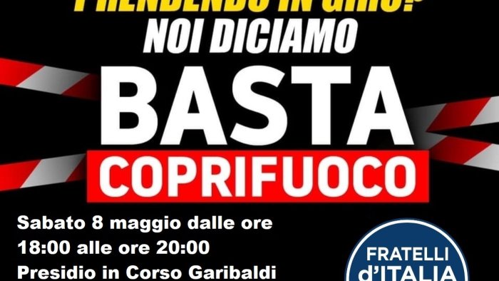 "Sarà una manifestazione nel rispetto delle regole vigenti che si svolgerà dalle 18 alle 20 con un flash mob presso la Prefettura di Benevento, per ribadire il nostro 'no' al coprifuoco - ha spiegato Ciro Vallone, responsabile organizzazione ed eventi di FdI Sannio - che è una misura inutile, anche a detta degli esperti, che poteva essere eliminata con l’ultimo ordine del giorno portato in parlamento da Fratelli d’Italia. Non ci tiriamo indietro e anche a Benevento manifestiamo la nostra contrarietà".