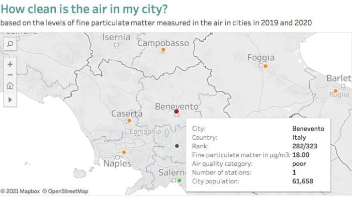 “L’Agenzia Europea dell’Ambiente ha stilato una classifica in base al particolato PM2,5 (polveri sottili) su 323 città europee monitorate sufficientemente. Benevento occupa la 282 posizione, con 18,0 μg/m3 del suddetto particolato, quindi in fondo alla classifica, con una qualità dell’aria classificata come “scarsa”. A Taranto, non presente nella classifica, l’OMS riporta comunque dati di tre centraline che, a seconda della distanza dall’Ilva, hanno medie annuali di 11,62 μg/m3, 12,08 μg/m3 e 16,10 μg/m3. Quindi, seppur città non industrializzata, a bassa densità abitativa e dagli ampi spazi urbanistici, Benevento presenta un’aria più inquinata di quella adiacente alla famigerata acciaieria tarantina”.