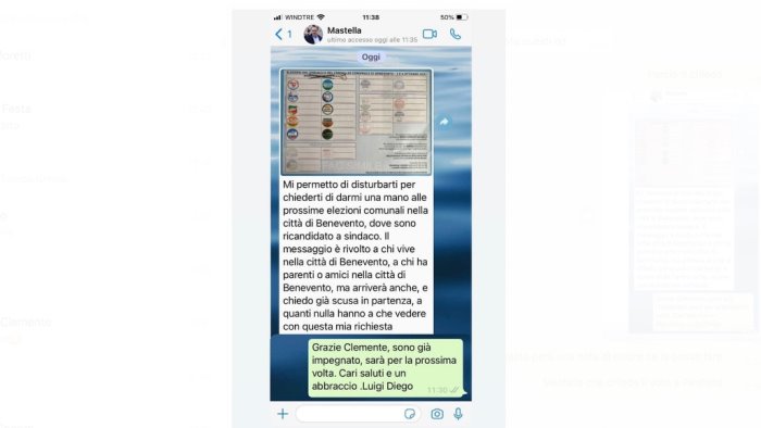 Mancano esattamente 7 giorni ed è tempo di appelli al voto: così il sindaco uscente affida a Whatsapp il suo, un breve testo con un fac simile, "mi permetto di chiederti una mano...".