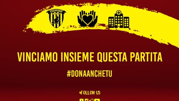 L'epidema di Covid-19, giorno dopo giorno, rischia di mettere sempre più in difficoltà il nostro Paese. I calciatori e lo staff tecnico giallorossi, consapevoli della gravità della situazione, scendono in campo a fianco dell'Ospedale Civile "G. Rummo" con una raccolta fondi alla quale partecipa anche la dirigenza del Benevento Calcio. Una partita importante che, se giocata tutti insieme, si può vincere, #DONAANCHETU. Per sostenere la struttura ospedaliera sannita e offrire un contributo si può inviare una email a segreteria-dg@ao-rummo.it in cui indicare: 1 - Chi dona, 2 - la somma da donare, 3 - un referente con relativi contatti (mail-telefono ecc.), 4 - motivazione (emergenza Covid). L’ufficio preposto poi contatterà per l’Iban.