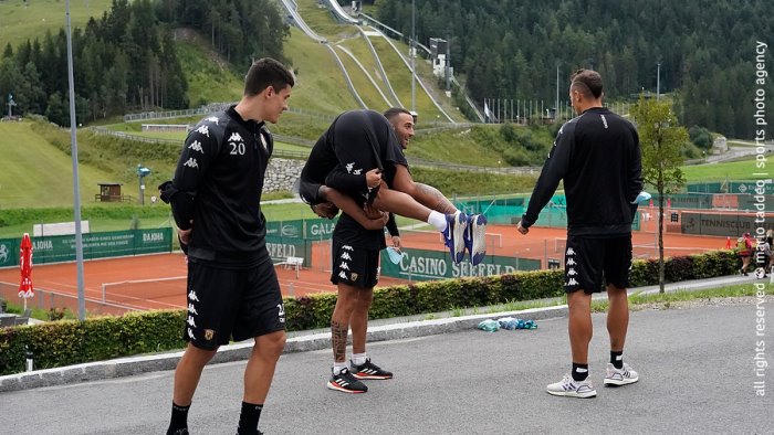 Mattinata di riposo per i giallorossi dopo i primi giorni di lavoro intenso. Inzaghi ha concesso una mezza giornata di libertà, che la maggior parte ha utilizzato per riposare. D'altro canto la grande coresione del gruppo si vede ogni giorno, con scherzi e burle di ogni tipo. Nella foto Roby Insigne prende sulle spalle Tello, dimostrando una forza fisica mica di poco conto...