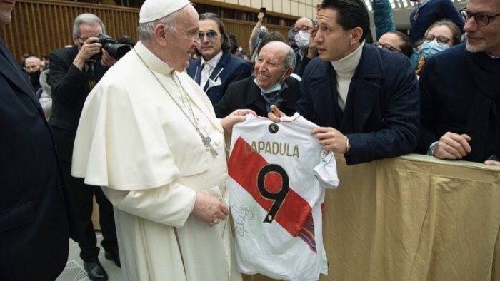 "In quest'anno del bicentenario in Perù, dove in Vaticano si è svolta la Nascita peruviana, ho avuto l'immenso piacere di poter consegnare personalmente al Papa una maglia della nostra nazionale. Grazie di cuore Santo Padre! E' stata una grande emozione verderlo e stringergli la mano".