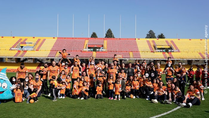 È stato tutto perfetto. Un pomeriggio da incorniciare. Perfino il calore del sole ha deciso di collaborare e di riscaldare il cuore dei più piccoli e delle loro famiglie. Emozioni che portano il nome di “In campo con papà #portami allo stadio” l'iniziativa organizzata dal Benevento Calcio con la collaborazione di Gg teamwear e dall'asilo nido FeliciDad con le responsabili Melania Pastore e Simona Russo. Sotto i loro sguardi attenti si è consumato un tempo prezioso, si è colorato di giallo e di rosso grazie alla presenza sul rettangolo verde del Ciro Vigorito dei piccoli dell'asilo portati per mano dai loro papà che per un giorno hanno potuto scambiare qualche passaggio con i calciatori del Benevento anche loro in compagnia dei propri figli. Tello aveva in braccio la sua piccina di appena due mesi, Caserta le sue tre donne ma anche Insigne, Improta, Paleari, Acampora, Manfredini, Gyamfi e Petriccione. Tutti accolti dai giovani del settore giovanile e dal responsabile delle attività di base Pegno che ha impegnato i bambini con tanti giochi interessanti, seguiti passo passo dalle mamme che hanno riempito le gradinate dello stadio. Era presente la terna arbitrale come merita una partita di calcio e le protagoniste del calcio femminile Under 17.