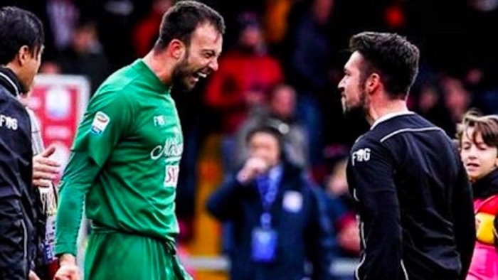 Nella foto: è il 3 dicembre del 2017, Brignoli ha appena segnato un gol a Donnarumma e il Benevento ha conquistato il suo primo storico punto in serie A. Si vede la felicità di Brignoli che va ad abbracciare proprio Francesco Farioli