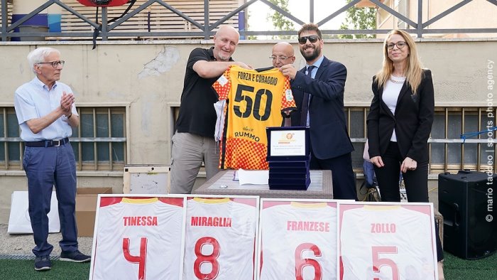 E' un giorno speciale per la Forza e Coraggio che festeggia i cinquant'anni dalla nascita. Al Campo Sportivo Mellusi si è celebrato questo importante avvenimento, alla presenza del fondatore Cosimo Falda, oltre ai parenti di Don Domenico Miraglia, Aldo Tinessa, Vincenzo Zollo e Lello Franzese, cofondatori del club. Presente anche il Benevento Calcio attraverso Alessandro Cilento. Il sodalizio giallorosso ha omaggiato la Forza e Coraggio attraverso una maglia celebrativa, suggellando la vicinanza e la stima reciproca tra due realtà che portano in alto il nome della città di Benevento nei rispettivi campionati.