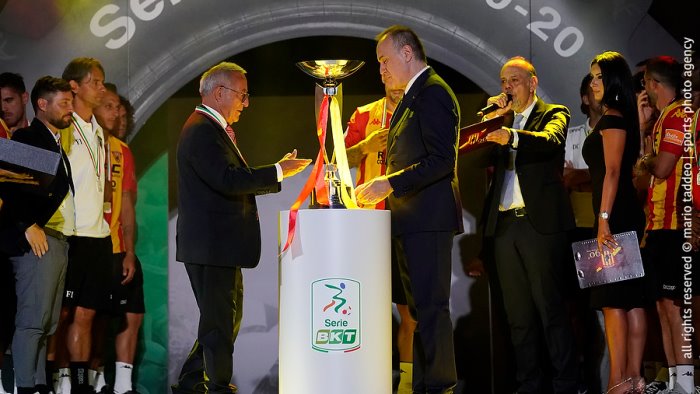 Nella foto il presidente del Benevento, Vigorrito, con quello della Lega di B, Balata in occasione della premiazione della vittoria nel campionato 2019-20