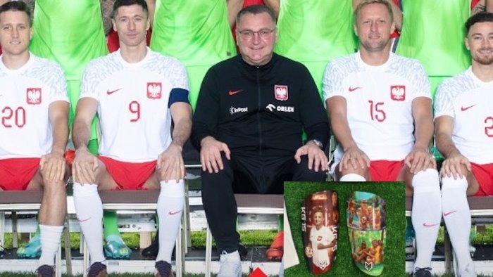 Nella foto di rito della Nazionale polacca, il Ct Michniewicz è seduto tra Lewandoski e Glik. Sotto la foto dei parastinchi personalizzati sui quali si vede il difensore con la maglia del Benevento e lo scudetto della Strega