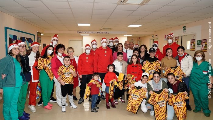 Momento particolare per i bambini del reparto Pediatria del San Pio, omaggiati questa mattina da una delegazione del Benevento Calcio. I giallorossi hanno preso parte alla festa del prematuro, iniziativa promossa dal nosocomio cittadino (leggi qui l'approfondimento), portando magliette e doni ai piccoli che sono costretti a trascorrere le festività natalizie in ospedale. Un momento toccante e di grande unione, utile a regalare gioie e sorrisi in un momento particolare.