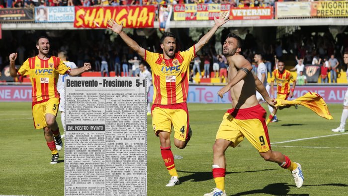 Nella foto la gioia di Ceravolo dopo il gol al 93' il 13 maggio 2017. Nell'inserto a sinistra l'articolo del Corriere dello Sport del 14 dicembre 1952, la prima sfida della storia tra Benevento e Frosinone