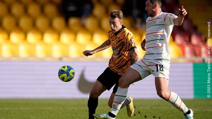 Nella foto Mato Jajalo contrasta La Gumina nel corso della sfida tra Benevento e Venezia