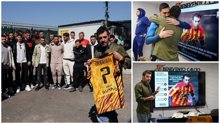 Mattinata diversa per i calciatori del Benevento, alle prese con delle intense sedute di allenamenti nella settimana in cui c'è la sosta del campionato. I giallorossi hanno incontrato Gianpaolo Imbriani, fratello del compianto Carmelo, ai quali ha presentato il proprio libro "Storia di una promessa" e tutte le esperienze maturate negli ultimi anni con l'obiettivo di portare il messaggio di Imbriani in giro per il mondo. I calciatori hanno ascoltato con attenzione le parole di Gianpaolo, il quale ha anche abbracciato Ghigo Gori, amico e compagno di squadra del mai dimenticato allenatore e capitano della Strega. Non è mancata la maglia giallorossa, rigorosamente con il numero 7, firmata da tutti i calciatori. Il ricordo di Imbriani è sempre vivo nel Benevento Calcio, come tra l'altro testimoniato lo scorso febbraio, quando lo stesso Gianpaolo ha incontrato la squadra nel giorno del compleanno di Carmelo.
