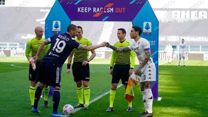 Nella foto, storica, la stretta di mano tra Viola e Bonucci, capitani in Juventus-Benevento (0-1)