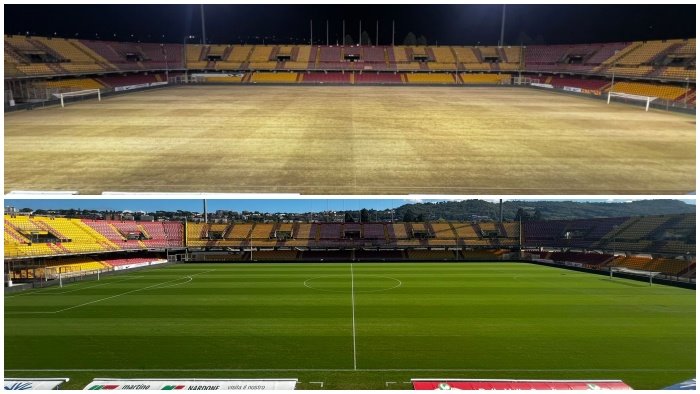 Ricordate i lavori al manto erboso effettuati subito dopo il triplice fischio del match tra Benevento e Picerno? Ebbene, dopo due settimane il Ciro Vigorito è più che pronto ad ospitare la sfida di domani con il Potenza. Il manto erboso è in ottime condizioni (nella foto il prima e il dopo), con la ditta Erga Green che ha lavorato nei minimi particolari nell'effettuare una operazione programmata da tempo e indispensabile per la tenuta eccellente del fondo dell'impianto sportivo di via Santa Colomba. Domani ci sarà il colpo d'occhio di sempre, come se lo scalping dello scorso 15 ottobre non fosse mai avvenuto. Un aspetto che farà piacere al tecnico Andreoletti, il quale tende costantemente a elogiare il manto erboso del Ciro Vigorito.