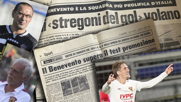 QUELLA VOLTA CHE... Dicevamo di due appuntamenti assai suggestivi. Il primo si riferisce al campionato di serie C 75/76. Per la precisione è il 25 aprile 76, Benevento non si è mai sentita tanto vicina alla B. La squadra allenata da Piero Santin è prima in classifica ed ha inanellato la bellezza di 8 vittorie consecutive, l'ultima delle quali la settimana prima al Vestuti di Salerno (2-1). Benevento calcistica è in fermento, al Maomartini c'è il Sorrento, una delle pretendenti alla promozione. Il piccolo stadio di Rione Libertà si riempie come un uovo: 12mila spettatori assiepati dovunque, 21 milioni di incasso, record assoluto per Benevento e per la C. Ma i record li fa anche la squadra di Santin, che batte 2 a 0 i peninsulari grazie ai gol di Penzo e Iannucci (su rigore): miglior attacco d'Italia (50 gol), migliore serie in corso (9 vittorie di fila, imbattuto da 12 giornate). Mancano sei turni appena al termine della stagione, i tifosi sentono la B in tasca e inscenano caroselli colorati per la città. Invece il destino sarà ancora una volta avverso: alla fine i giallorossi crolleranno inspiegabilmente e la spunterà il Lecce (una sola promozione su 20 squadre).