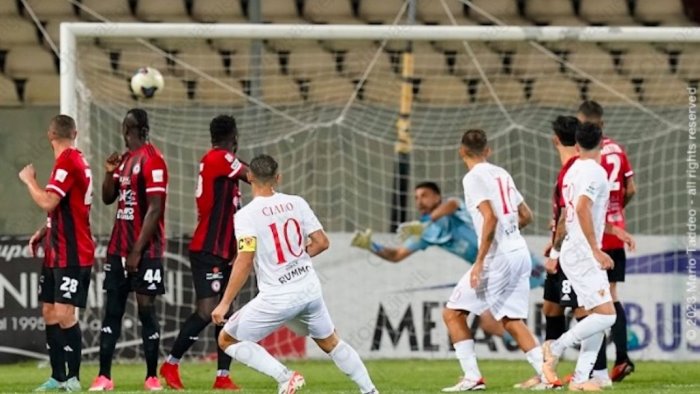 Nella foto il palo colto da Ciano nella gara d'andata allo Zaccheria