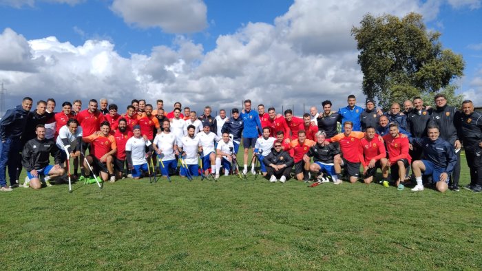 Calcio e solidarietà, l'espressione più bella dello sport. Al Mancini, questo pomeriggio, è arrivata la Nazionale Italiana Amputati, reduce dal bel secondo posto conquistato ad aprile nel torneo internazionale in Polonia. Due vittorie con l'Olanda e una sola sconfitta col minimo scarto contro la squadra di casa, la Polonia. La Nazionale azzurra si allenerà per qualche giorno al Mancini e la squadra allenata da Francesco Ramunno è stata felicissima di immortalare con una foto di gruppo l'incontro con la compagine giallorossa che aveva appena terminato la seduta pomeridiana (unica giornaliera dopo il maltempo della mattina). La rappresentativa azzurra, che gioca sotto l'egida della Fispes (Federazione italiana sport paralimpici e sperimentali), ha come prossimo appuntamento il campionato Europeo di giugno in Francia.