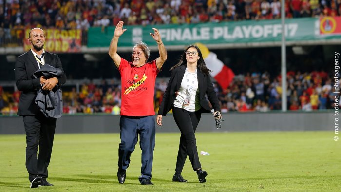 In alto una foto di Taddeo ormai iconica: il giro di campo del presidente Vigorito dopo la promozione in serie A nel 2017
