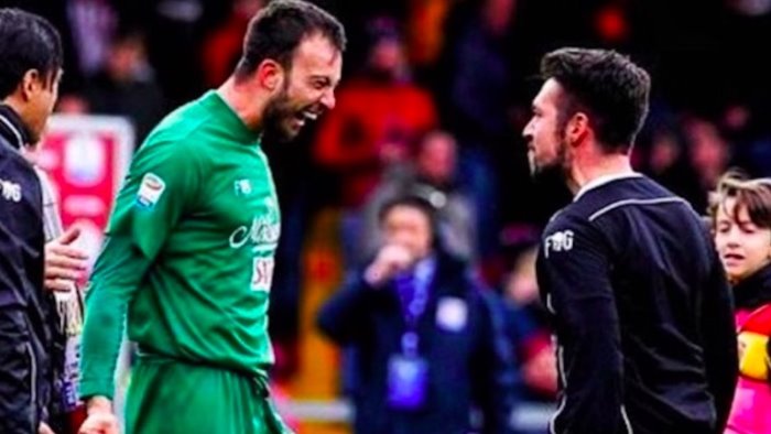 Nella foto: è il 3 dicembre del 2017, Brignoli ha appena segnato un gol a Donnarumma e il Benevento ha conquistato il suo primo storico punto in serie A. Si vede la felicità di Brignoli che va ad abbracciare proprio Francesco Farioli