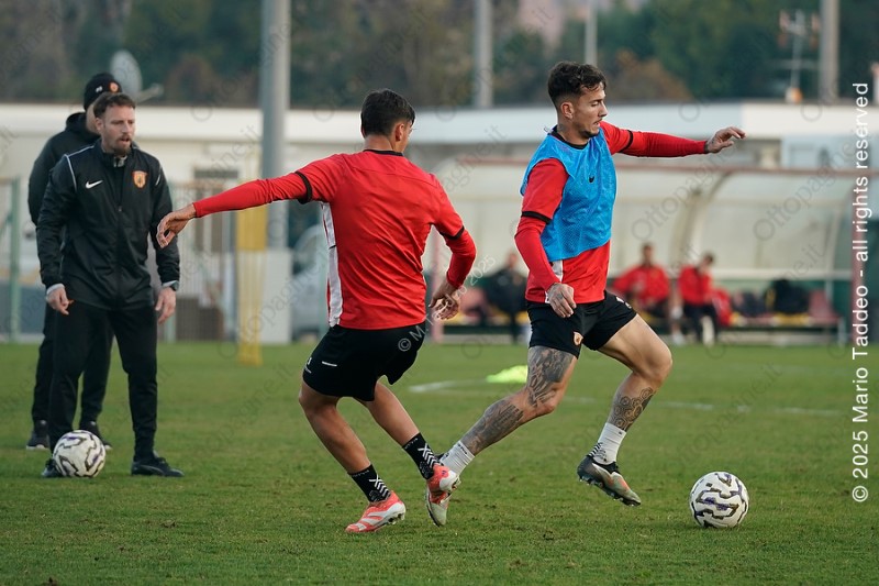 Come sempre Floro Flores chiede alta intensità nelle esercitazioni. Due gruppi numerosi in campo a esercitarsi sui tocchi di prima, torelli infiniti, che mettono in mostra le doti tecniche di tanti giallorossi.