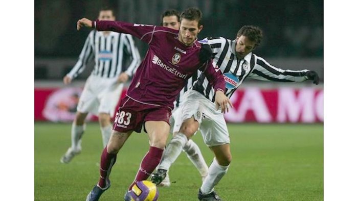Nella foto Floro con la maglia dell'Arezzo contrastato da Del Piero