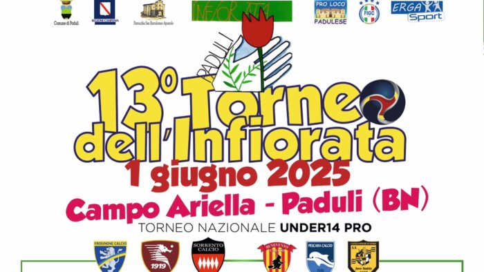 Si svolgerà domenica l'attesa tredicesima edizione del Torneo dell'infiorata, in programma a Paduli. La manifestazione vedrà la partecipazione delle formazioni giovanili under 14 Pro di società professionistiche. Ci sarà il Benevento Calcio e non solo: sono presenti anche Frosinone, Salernitana, Sorrento, Pescara e Juve Stabia. Il match inaugurale è in programma alle ore 10 e vedrà fronteggiarsi Benevento e Juve Stabia. Le sfide si giocheranno nel corso della giornata, con la finalissima fissata alle 19. Lo scenario sarà quello del Campo Ariella.