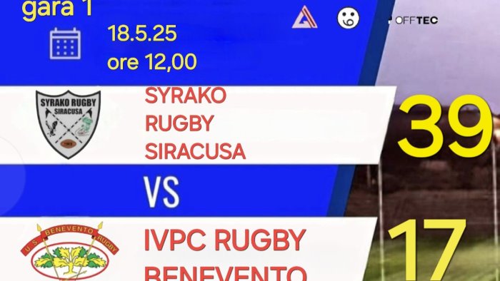 Sul campo in sintetico di via Forlanini a Ragusa va in scena l’andata della finale promozione. Parte a razzo il XV Sud-Est (franchigia tra Ragusa e Siracusa) che al 15’ si ritrova già con 3 mete in carniere segnate da Mazzone, Bordonaro e Ponteprimo (15 a 0). Il Benevento ha una reazione veemente e si riversa stabilmente nei 22 avversari. Arrivano così due mete con D’Addio al 20’ e Colantuono al 30’ (15 a 12). Il finale di tempo è a favore dei siciliani che al 37’ segnano con la mischia che entra di forza in area di meta, Mazzone mette a terra (20 a 12). Il secondo tempo inizia con due gialli a carico di Di Natale e Guastella (XV Sud-Est). Il Benevento ne approfitta e con una bella azione alla mano va in meta con l’ala Coppola al 49’ (20 a 17). I siciliani tornano in attacco e dopo un’azione prolungata a ridosso dei 5 metri vanno in meta al 54’ con Fazzino (27 a 17). Al 55’ e al 57’ sono i beneventani Colantuono e Coppola a ricevere il giallo e, puntuale, arriva al 60’ la quinta meta dei sudestini con Bordonaro che finalizza un’azione alla mano dopo una rimessa laterale conquistata (34 a 17). Quindi la gara vive un periodo caratterizzato da capovolgimenti di fronte, ma senza occasioni rilevanti. Il Benevento ha bisogno di trovare la quarta meta per il bonus. All’80’ arriva il momento propizio in quella che si rivelerà l’azione chiave dell'incontro: punizione per il Benevento nei 22 avversari. I sanniti scelgono di giocare alla mano sulla sinistra, ma il secondo passaggio è impreciso ed è intercettato da Paternò che si invola in splendido isolamento a schiacciare in meta, ripetendo la prodezza che gli era già riuscita nella semifinale di andata col IV Circolo (39 a 17). Così sfumano le speranze di quarta meta e si allarga il divario da colmare in gara due.