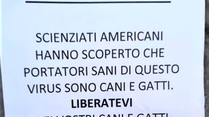 Un falso volantino che incita a sbarazzarsi di cani e gatti in quanto portatori del corona virus è apparso in provincia di Udine per la precisione a San Giorgio Nogaro. Il volantino apparentemente di mano ignota è una vera e propria pericolosissima fake news in quanto sostiene che cani e gatti sono i portatori del corona virus ed invita a liberarsi di fido e micio. Una assoluta falsità per la quale è scattata una denuncia penale che sarà inviata domani alla procura di Udine. Il secondo untore è un predicatore fai da te sudamericano che gridava nella giornata di ieri nel centro di Milano che i responsabili della polmonite chiamata corona virus sono i piccioni. Anche per questo soggetto nei prossimi giorni scatta la denuncia penale per procurato allarme. Ricorda in una nota l'Associazione Italiana Difesa Animali ed Ambiente - AIDAA che: "Gli animali non hanno alcun coinvolgimento con il corona virus e quindi chiunque dice il contrario mente sapendo di mentire e per questo verrà denunciato alle autorità giudiziarie".