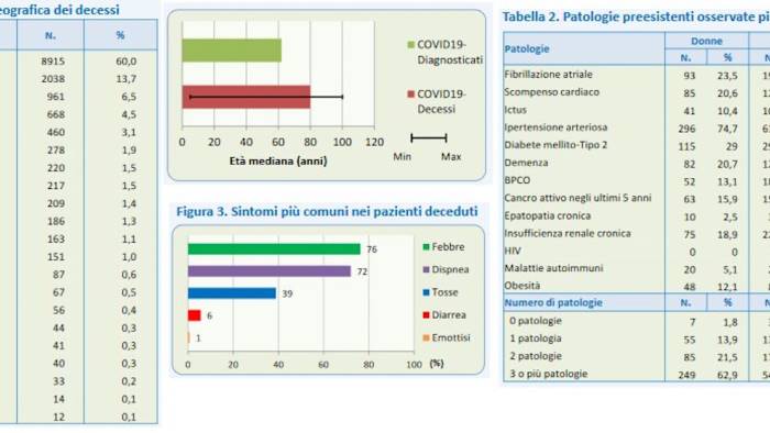 Al 6 aprile è emerso che la maggior parte dei decessi (il 60 per cento) è avvenuto in Lombardia, (in Campania invece lo 0,6 per cento dei decessi) l'età media dei deceduti è di 80 anni, mentre l'età media dei pazienti diagnosticati positivi è di 62anni. Il 96,8 per cento dei pazienti deceduti ha almeno una patologia cronica e il 61,9 per cento ha 3 o più patologie.