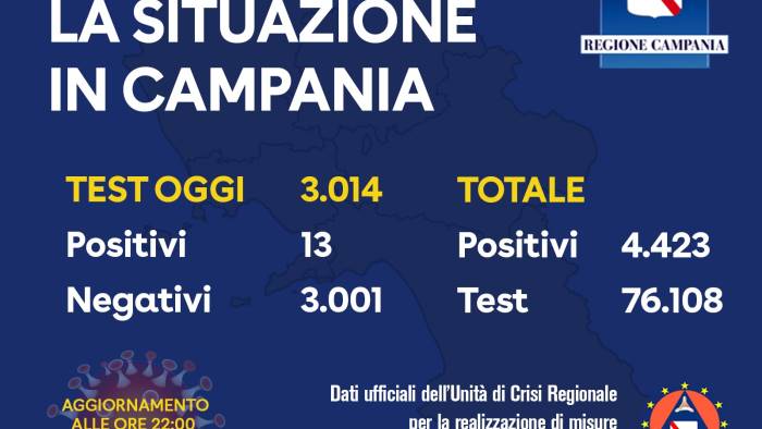 L'Unità di Crisi della Regione Campania comunica che sono pervenuti i seguenti dati: