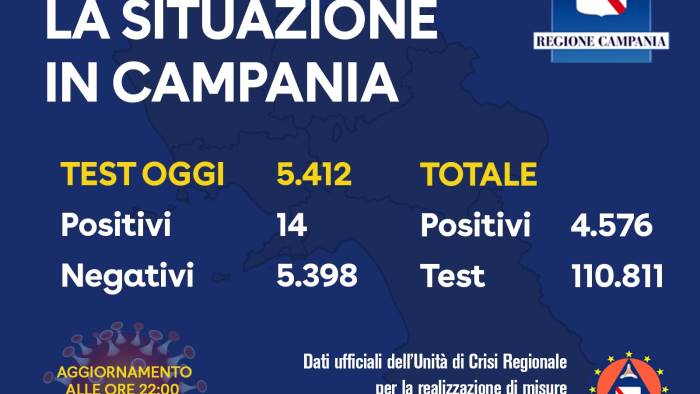 L'Unità di Crisi della Regione Campania comunica che sono pervenuti i seguenti dati: